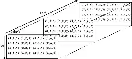 张量包含超出该二维平面的尺寸。 你可以将数字排列在一个立方体中,就会轻松地画出一个三维张量。 这是一个以平坦方式呈现的2 x 3 x 2张量(它画出了每个沿z轴延伸的2元数组的底部元素,直观地理解为什么它被称为三维数组):