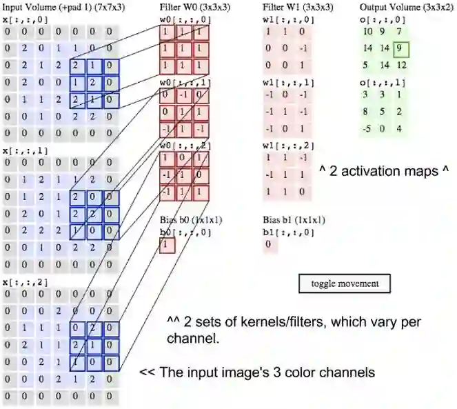 当图像通过卷积网络时,我们将根据输入卷和输出卷来描述它们,在数学上将它们表示为这种形式的多维矩阵:30x30x3。 从一层到另一层,它们的尺寸会发生变化,原因将在下面解释。