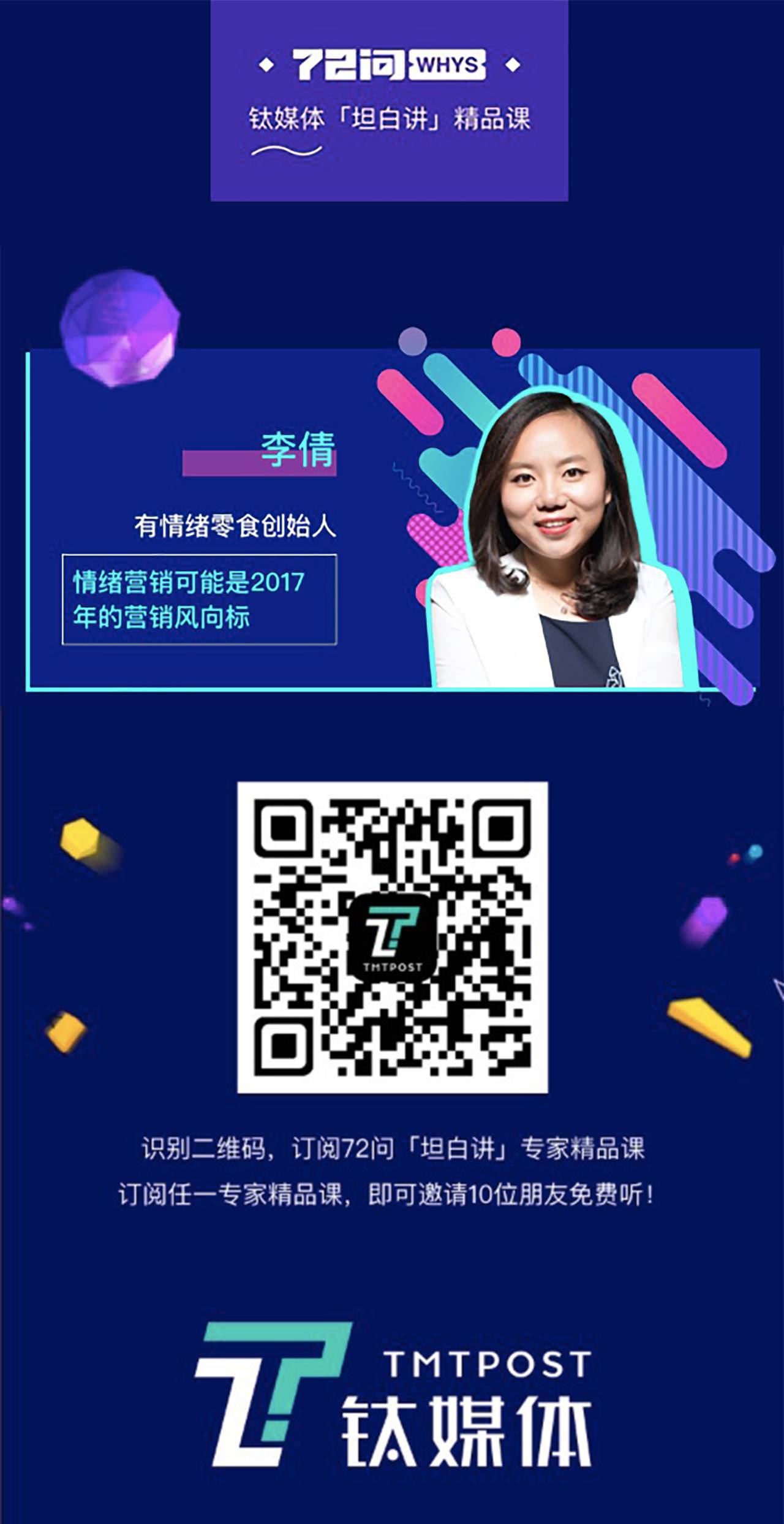 如果你是苦恼于企业产品品牌定位的人;如果你是苦恼于产品营销无法达到预期效果的人;如果你是苦恼于内容低传播率的新媒体创作者。那就不要错过李倩的音频分享课【 情绪营销可能是2017年的营销风向标】(可点击阅读原文直接订阅,或者下载最新版钛媒体APP体验更好哦)。