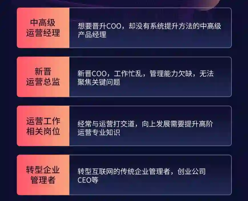 第三,这门课程不会涉及社群搭建和裂变活动等实操细节,更多的是专注给大家一个更高的运营维度,站在战略、全渠道、品牌、营销、数据的角度去拓宽运营管理者的知识宽度,提升核心能力。