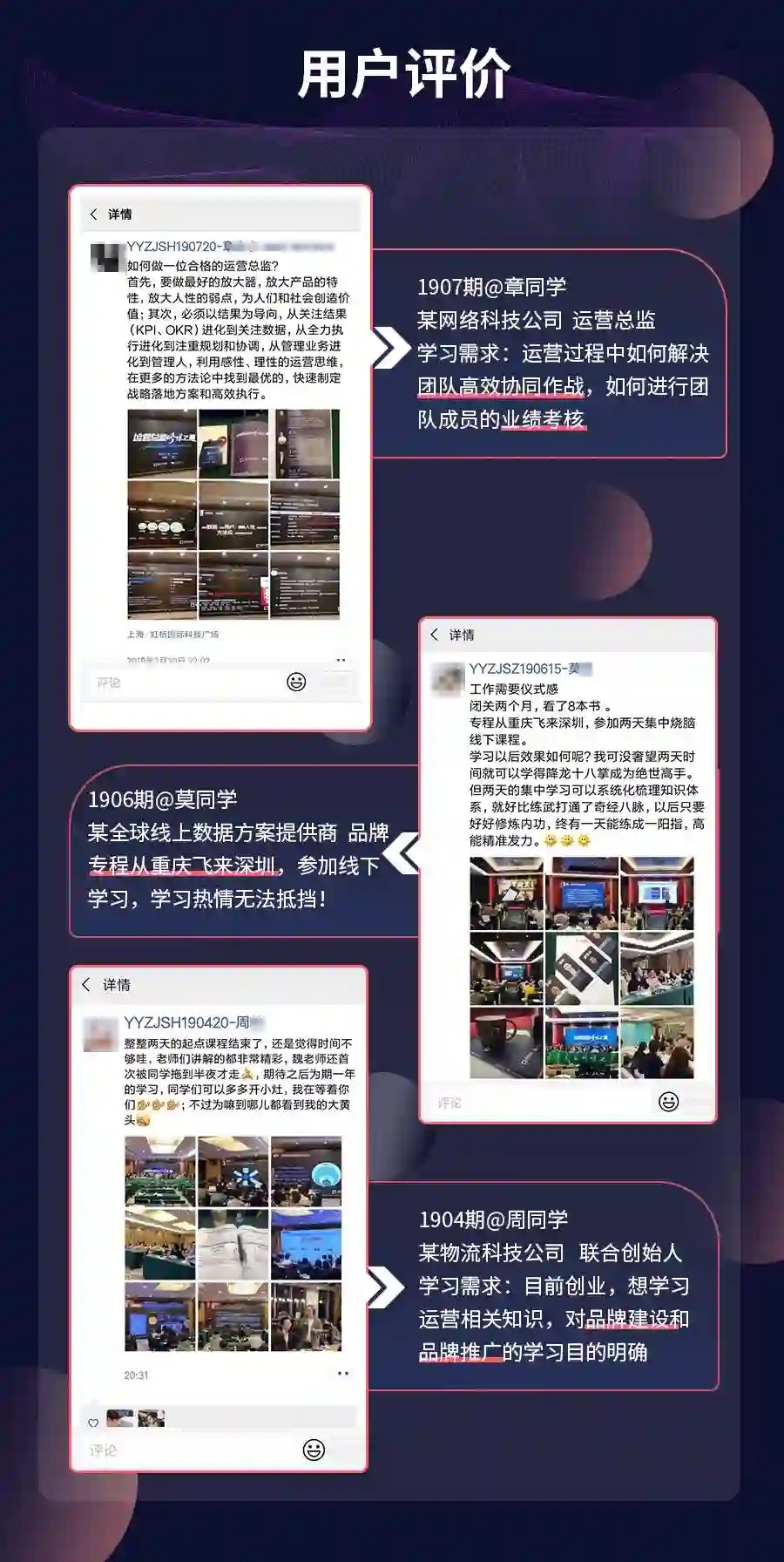 课程推出至今已经开班27期,帮助5000多名运营管理者和进阶者掌握更加系统全面的运营专业知识和管理思路,在处理类似运营战略规划、不同渠道运营策略和流量变现、品牌营销玩法、数据分析等实际问题时有更清晰的解决方向。