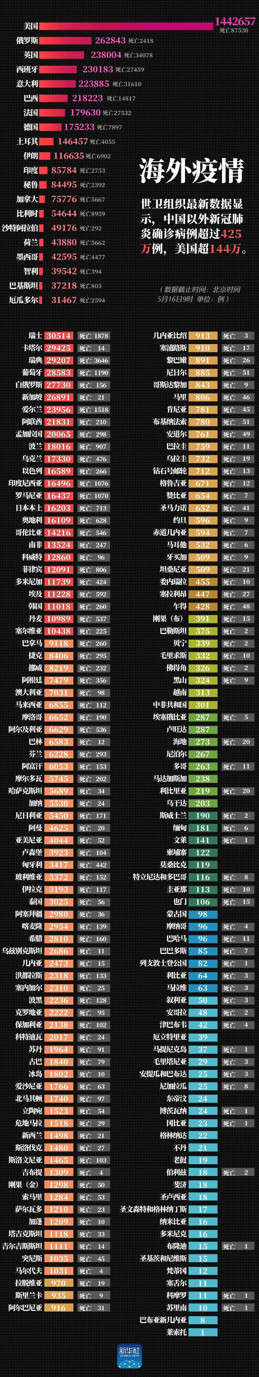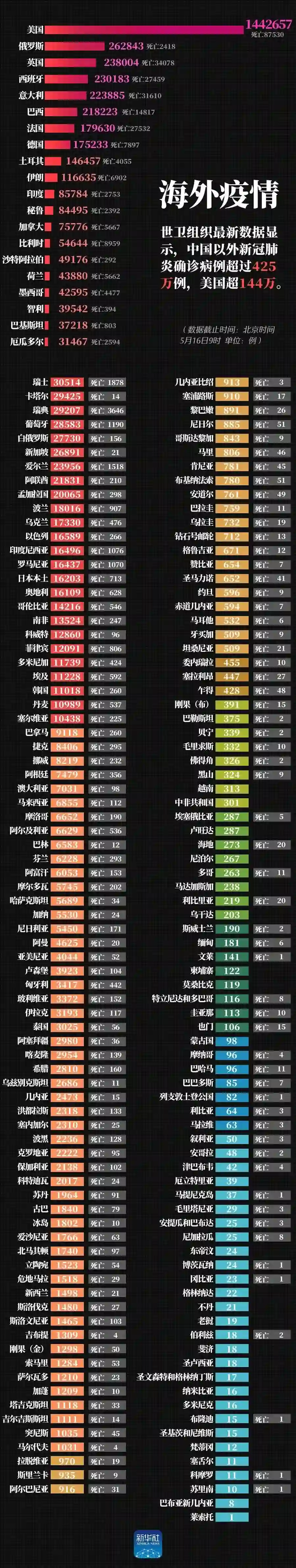 世卫组织最新数据显示,截止北京时间5月16日9时,中国以外确诊病例超过425万例,美国超144万例。
