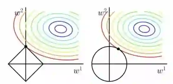 左边为L1正则化,右边为L2正则化。假设权重参数w只有二维w1和w2。L1为各元素绝对值和,即|w1|+|w2| = C,则得到的形状为棱形,L2为(w1)^2+(w2)^2 = C,则形状为圆。很容易可以发现L1更容易在顶点处相切,L2则不容易在顶点处相切。顶点处则其中一个参数为0,这就是为什么L1会使得参数稀疏的原因。
