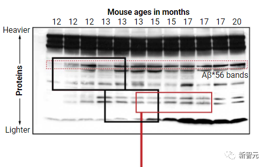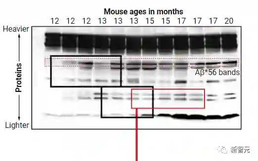 另外一个确凿的证据是,红框中的蛋白质条带在小鼠生命周期中的出现时间要比Aβ*56晚。