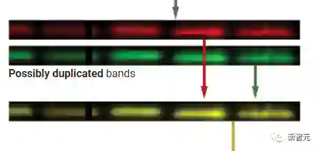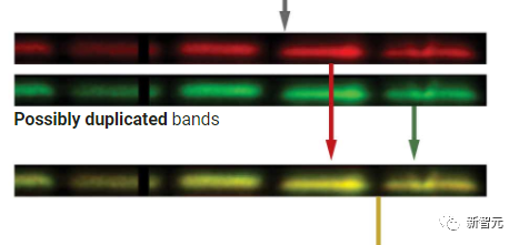 同时,他将图像上色使蛋白质条带更加清晰,下图可以看到疑似复制过的蛋白质条带。
