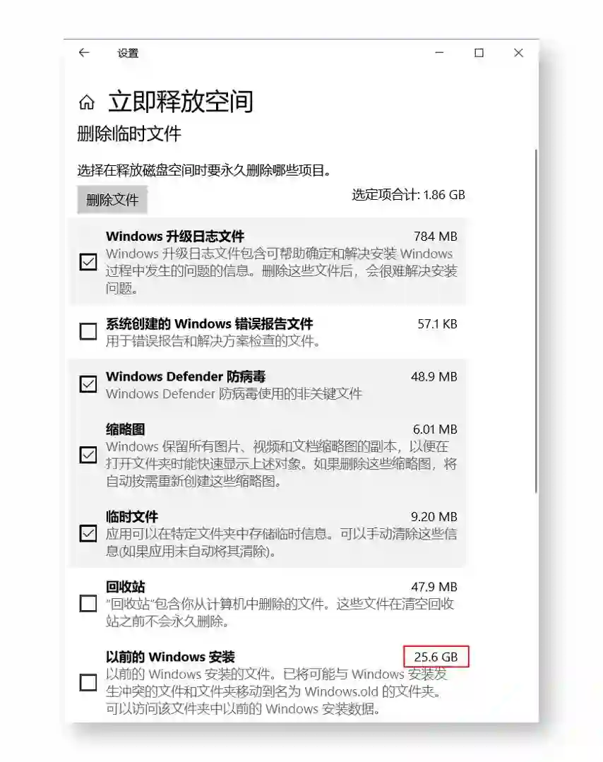 Windows 10 在设置中有一个【存储感知】的功能,你可以在设置 -> 系统 -> 存储 中找到它并开启。此外,你还可以点击 【立即释放空间】删除之前的系统更新文件,首次删除可能会吓你一跳,它可能会占用 几十G ,勾选后点击删除即可。