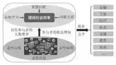 区块链智能技术是一种广泛应用于社会经济领域的一种新型技术, 它包括应用于底层的区块链技术和运作于区块链之上的通证经济体系。如图 8所示, 区块链具有去中心化、自治化、透明不可篡改、可追溯性等特性[14-15], 其应用使传统上难以流通和商品化的"注意力"与"信用度"成为可以批量化生产的流通商品, 革命性地提升经济活动范围与社会效率, 区块链技术具有成为智能经济的基石的潜质.通证经济是支撑区块链实现权益快速流动与安全交换的一种机制[16], 构建改变生产力和生产关系的智能经济模式离不开通证经济体系。利用区块链的特性和通证经济的行为激励作用, 社会智能经济体系中良性经济行为的参与者会逐步增多, 最终会引领社会经济导向, 使得整个社会参与者的收益增多。同时, 通证经济的激励作用还会优化社会的资源匹配, 通过社会认知学习和沟通交流来提高社会效率。