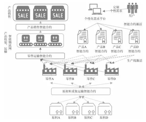 工业智联网的高速发展催生了种类繁多的智能工业新模式。图 10展示了社会化大规模商品定制模式的基本流程, 各工业单位通过采用工业智联网的技术, 将串行的工业生产流水线拆分成了单一的生产单元, 结合区块链智能合约技术, 每个生产单元通过智能合约将自己的产品连接进不同的产业链中。消费者可通过在智能终端输入需求数据, 制定自己需要的专属商品, 需求确立后, 将触发整个生产链的智能合约, 生产链中与商品相关的生产单元将通过智能合约实时定义组成多条生产线, 完成相应的生产指令。生产完成的产品通过智能合约进行运输, 直接送到消费者手中, 从而实现商品的社会化大规模定制。同时, 消费者还可通过工业智联网技术对商品的原材料、零件生产、拼装运输等流程进行回溯, 保证生产过程的透明化, 保证商品的高质量和高可信度。