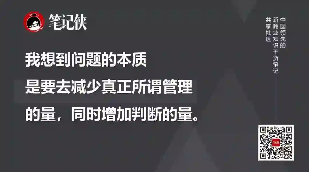 那么怎样才让管理变得更有效率呢?我想到问题的本质是要去减少真正所谓管理的量,同时增加判断的量。增加帮团队在关键点做决定和梳理目标的量。于是事情的核心就变成了培养做判断的能力,而不是勤勉工作的能力。