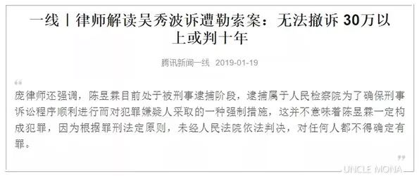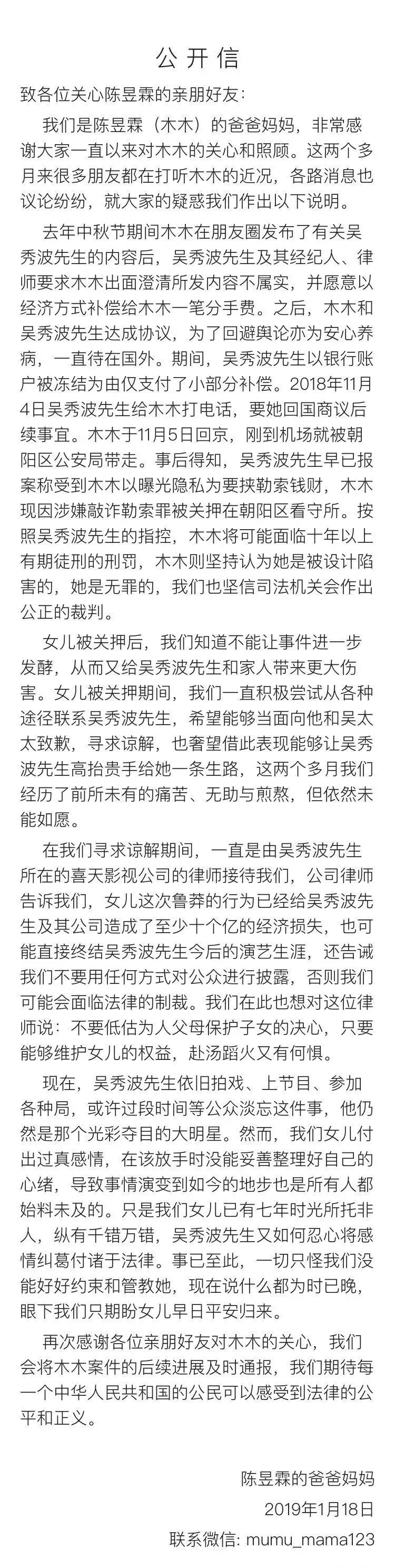 陈梦琳(微博名“陈显霖木木”、微信名“木木”)因在微信上发布不实言论涉嫌敲诈勒索吴秀波先生的案件已经公安部门刑事拘留并经检察院批准逮捕。2019年1月18日,原陈梦琳的微信圈及微博上出现署名为陈显霖的爸爸妈妈发表了封《公开信》,公开信内容不属实,我们已将此情况反映给公安机关,并将追究发表人的法律责任。该案件已经进入司法程序,本律师敬告各大媒体自媒体及广大网友不要传播不实信息,一切皆以法律最终裁决为准对于任何侵犯吴秀波先生合法权利的行为,本律师将代表吴秀波先生采取一切必要法律措施追究其法律责任。