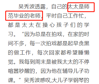 不过吴秀波缺对外说过,自己的太太只是师范毕业的老师。