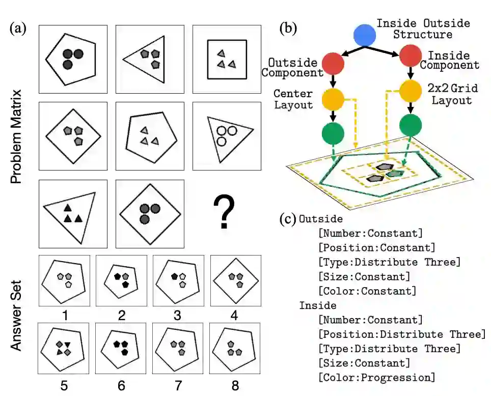 图 1 显示了 RPM 问题及其结构表征。提供了由视觉上简单的元素组成的两行图形,一个必须有效地导出正确的图像结构(图 1(b))和基本规则(图 1(c)),从而共同推理出最佳的候选图像。就所需的推理水平而言,RPM 可能比 RPM 更难: