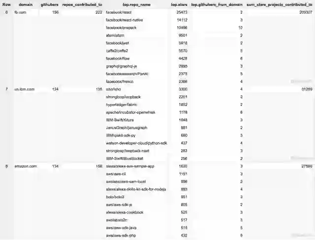 Facebook 和 IBM(US) 的 GitHub 用户数量与亚马逊的相似,但他们贡献的项目收获到了更多的 star(尤其是 Facebook):