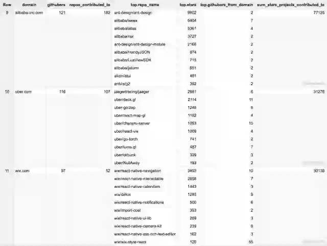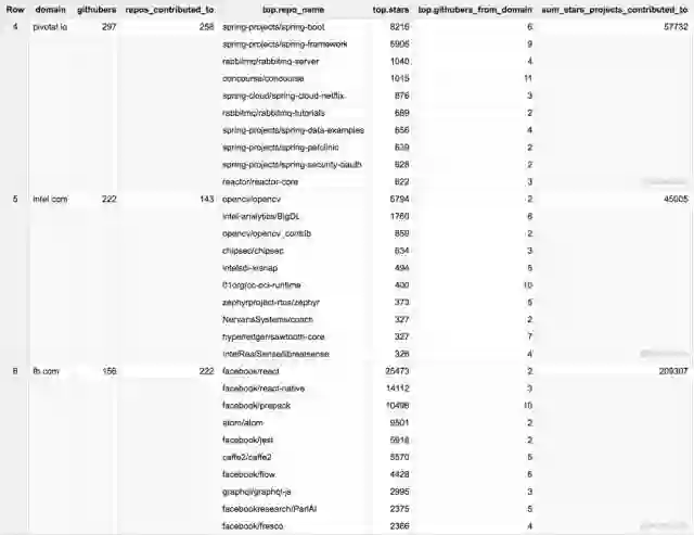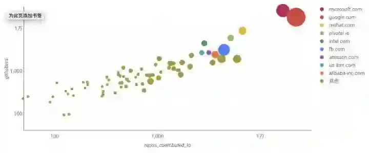 作者对于每个 GitHub 用户都尽量分辨了他们属于哪个组织,并且只关注在 2017 年增长超过 20 个 star 的仓库(比如 Apache 目前在 GitHub 有超过 1500 个仓库,但只有 205 个在今年获得了 20 个以上的 star。因此,这里只分析这 205 个仓库的提交情况)。
