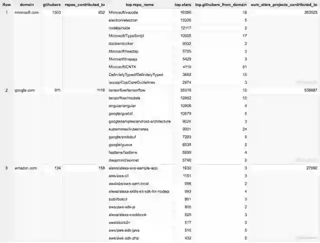 谷歌员工贡献的代码仓库比微软的多了 25%,存储卡获得的 star 数也更多(530,000 vs 60,000)。亚马逊仓库 2017 的 star 总数为 27,000。