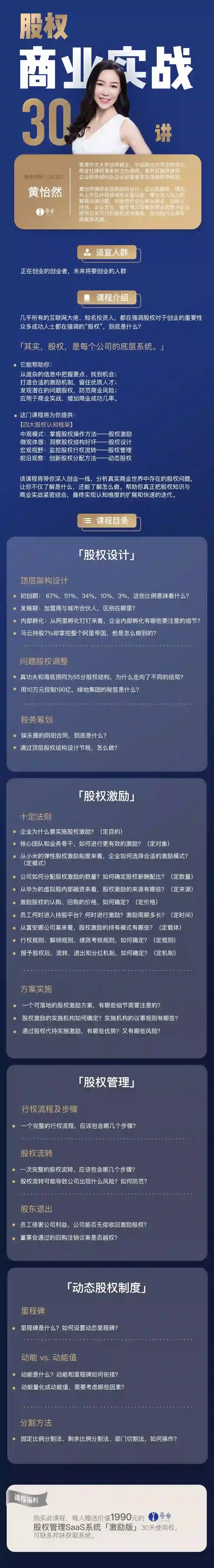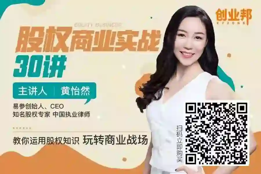 现在,为了让更多的创业者规避股权法律风险,知名股权专家:黄怡然在创业邦星际学院上开设了一套课程:《股权商业实战30讲》,从股权激励、股权设计、股权管理、动态股权这四个方面分析真实商业世界中存在的股权问题,让你不仅了解是什么,还能了解怎么做。