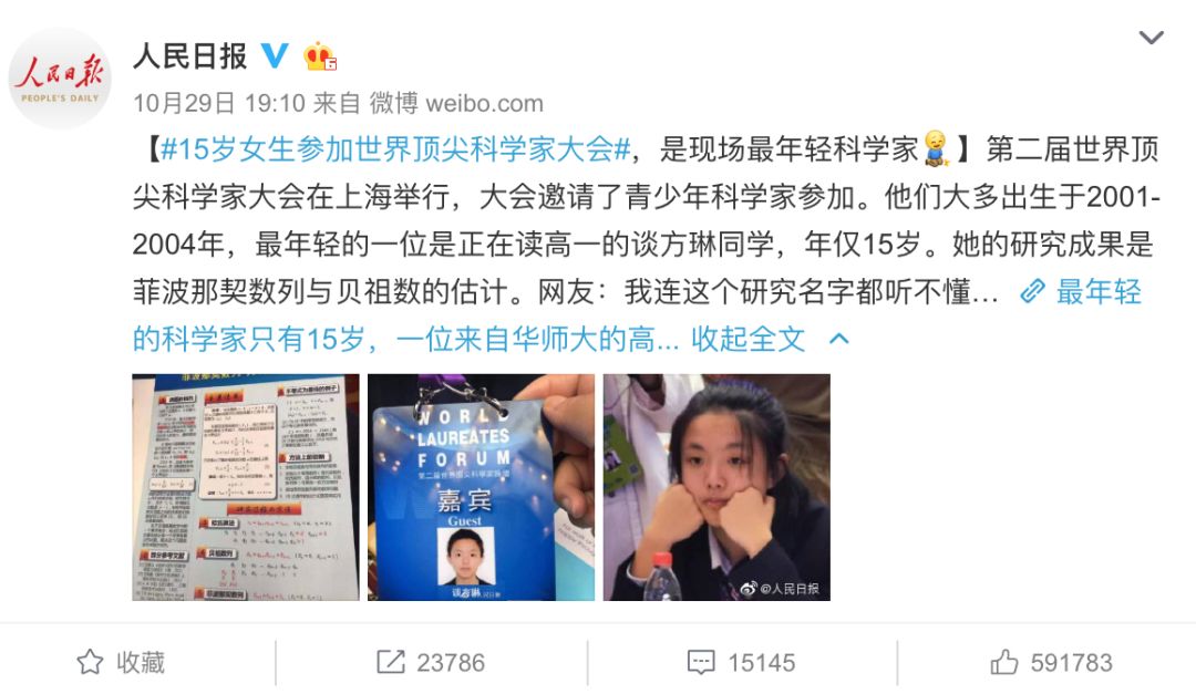 中国15岁“最年轻科学家”:初三研究“斐波拉契数列“夺冠,再出席世界顶尖科学家论坛