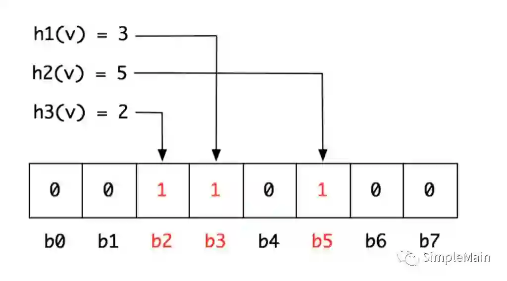3、当一个值(v)需要放入到存储系统的时候,将这个值进行k次的hash运算,比如:我们将m=8, k=3。就是位图有8个二进制位,然后有3个hash函数。