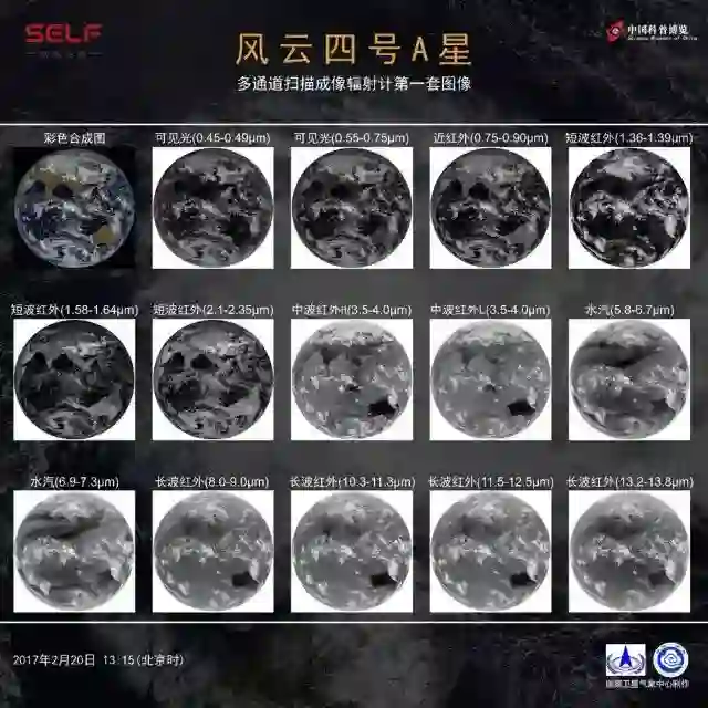 下面这些图从第二张开始是风云四号辐射计拍摄的一些不同波段的图,每一张图代表一种单色光,但实际上其中的可见光只有前面的两张,后面就是近红外还有红外的图片,每一张图片上面的一个像素点都可以推导出一个具体的温度,跟实际温度比,误差小于一度。