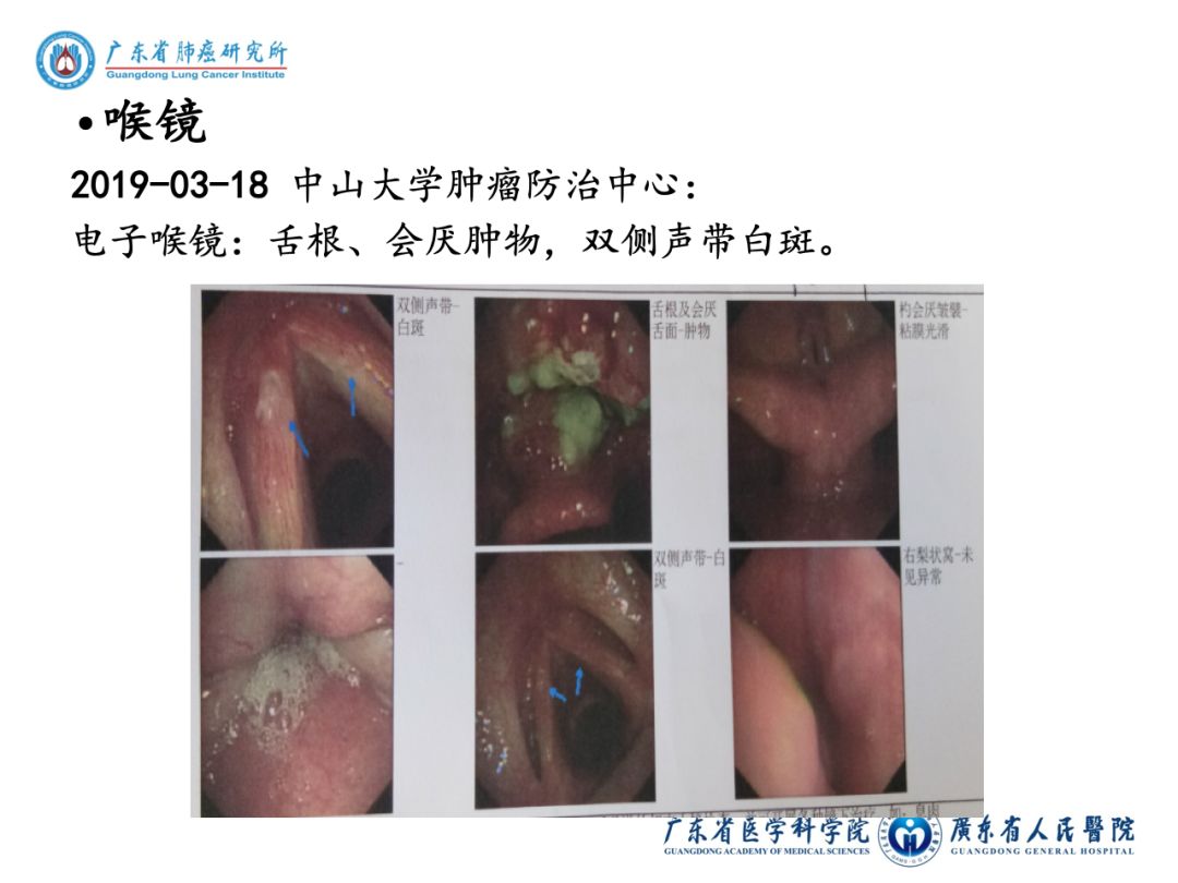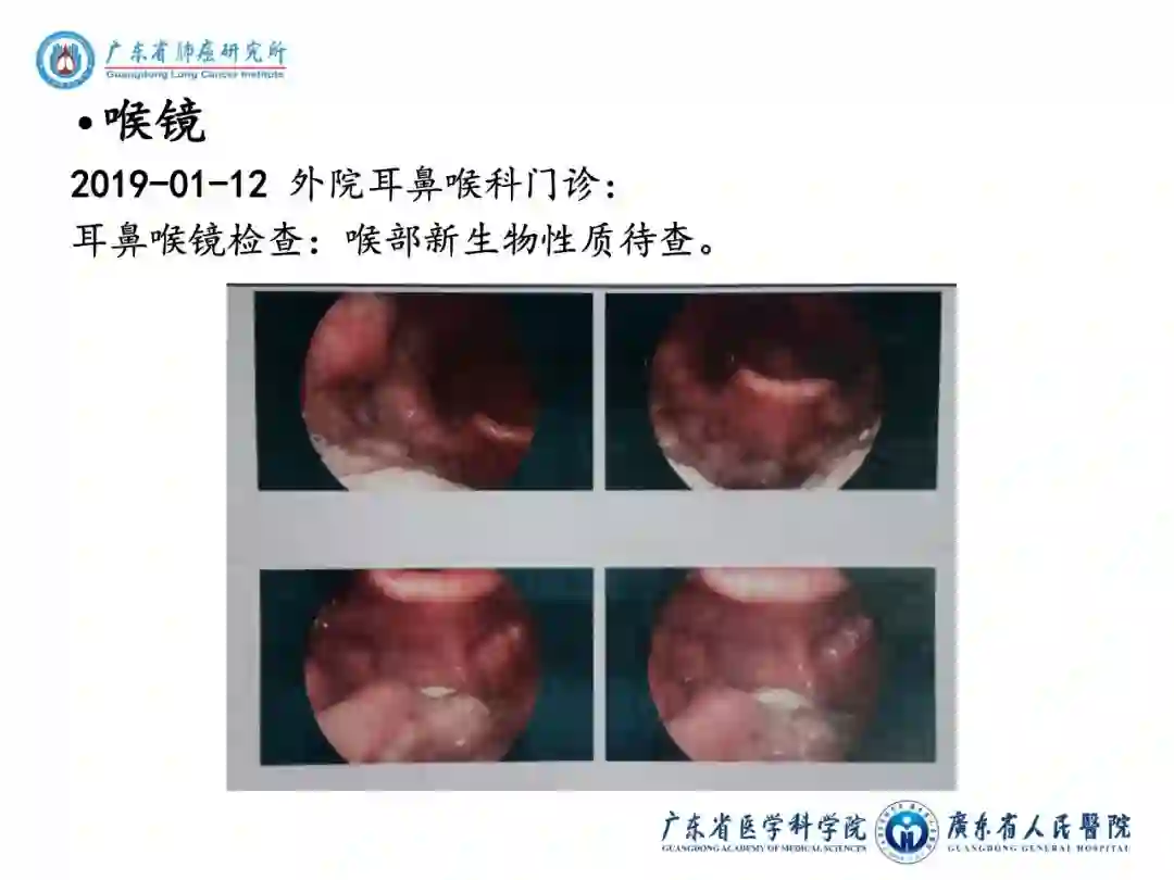 ① 喉前庭、舌骨后方占位病变(大小约1.6cm×2.3cm),考虑新生物,喉癌可能性大,建议活检。