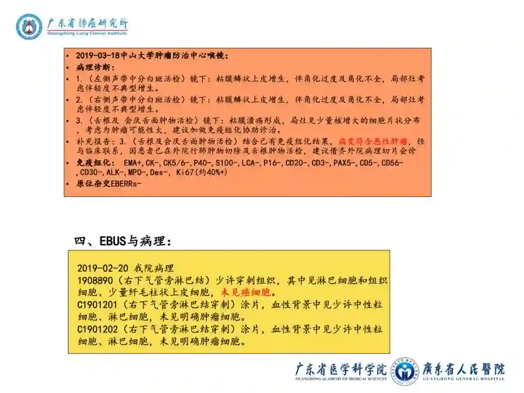 5)2019-02-20于我院行EBUS-TBNA,R2淋巴结病理未见明确癌细胞。