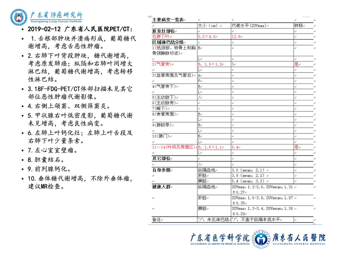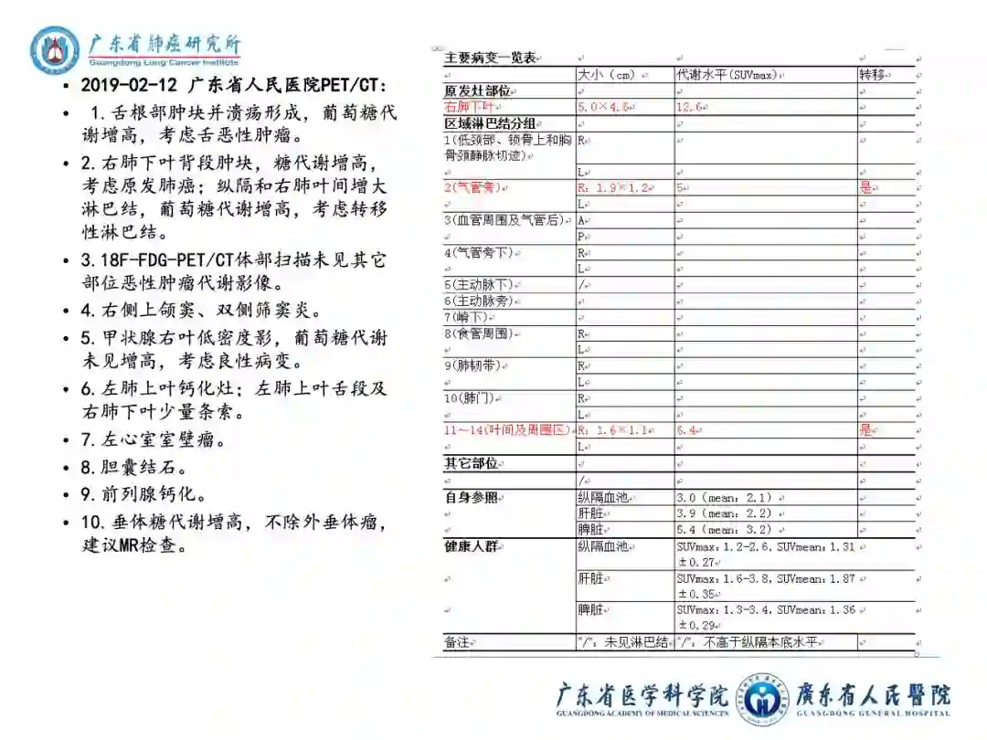 ② 右肺下叶肿块5.0cm×4.6cm,SUVmax12.6,考虑原发肺癌;R2淋巴结增大,SUVmax5。