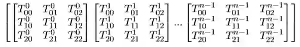 再看T,第一组为T[0][0],T[1][0],T[2][0],第二组为T[0][1],T[1][1],T[2][1], 第三组为T[0][2],T[1][2],T[2][2]。我们能其实够很明显的看出第一组为T的3∗ 3矩阵第0列,剩下的分别为第1列,第2列,即矩阵T为: