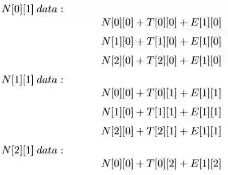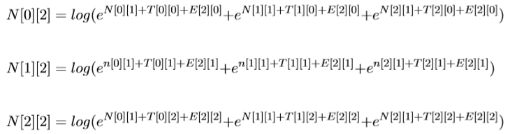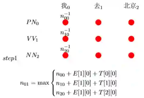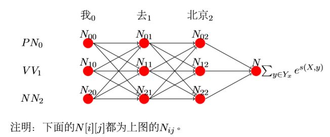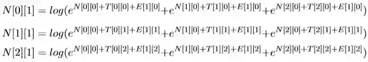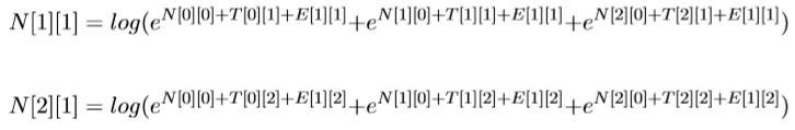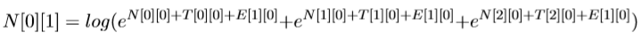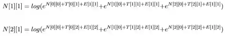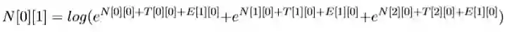 N[0][1]表示前一个选择PN的得分+‘去’选择PN的得分(‘去’选 择PN的得分为T[0][0]+E[1][0]),前一个选择V V 的得分+加上‘去’选 择PN 的得分,加上前一个选择NN的得分+‘去’选择PN的得分。公式为: