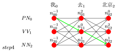 在最后我们假如n_22最大,而且它的前一个路径为1,则看到n_11的前一 个路径为0,而且n_00的前一个路径为−1,表示结束,则整个路径就有了, 即为n_00− > n_11− > n_22,如图step4: