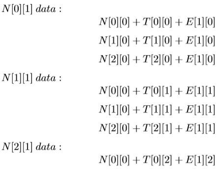 我们会发现,矩阵N T E的第一列按位相加的结果刚好是N[0][1],同理的,第二列,第三列分别按位相加分别得N[1][1],N[2][1],即: