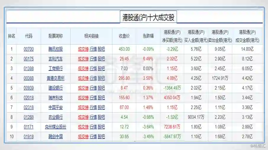 今日港股通(沪)前十大成交个股是腾讯控股、吉利汽车、工商银行、香港交易所、建设银行、瑞声科技、中国平安、农业银行、兖州煤业股份、融创中国。其中净流入最多的个股是香港交易所,净流入4.08亿港元;净流出最多的个股是腾讯控股,净流出3.29亿港元。