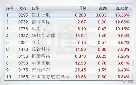今日港股通标的中涨幅前五的个股是江山控股(00295.HK)、信利国际(00732.HK)、彩生活(01778.HK)、华虹半导体(01347.HK)、李宁(02331.HK);