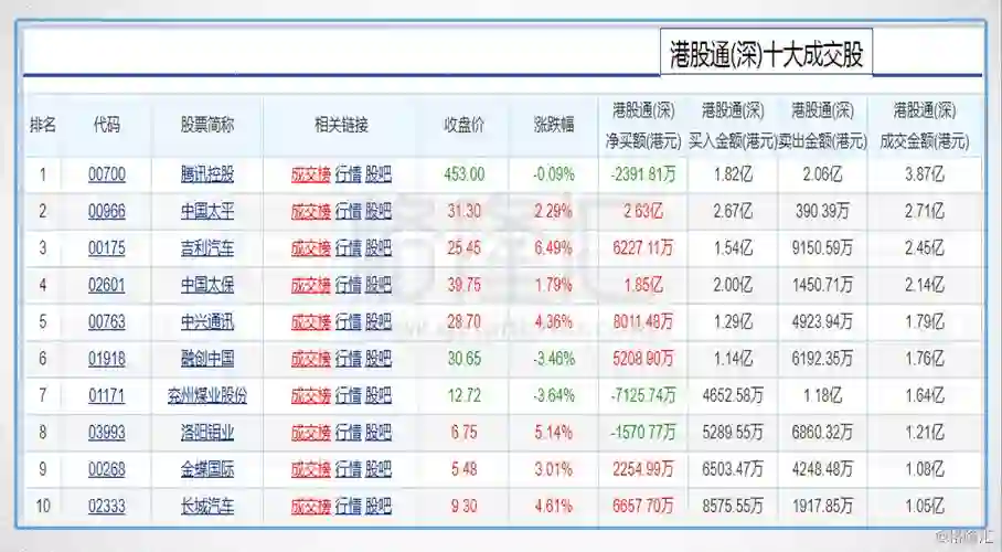 今日港股通(深)前十大成交个股是腾讯控股、中国太平、吉利汽车、中国太保、中兴通讯、融创中国、兖州煤业股份、洛阳钼业、金蝶国际、长城汽车。其中净流入最多的个股是中国太平,净流入2.63亿港元;净流出最多的个股是兖州煤业股份,净流出7125.74万港元。