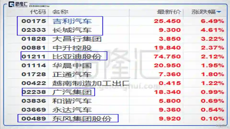汽车股显著造好,吉利汽车(00175.HK)大涨6.5%,成为恒指中表现最佳的蓝筹。长城汽车(02333.HK)也涨4.6%。此外,比亚迪股份(01211.HK)涨2.1%。