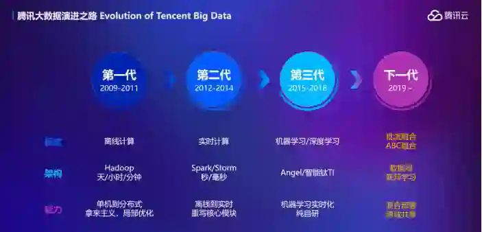 :以 Hadoop 为核心的离线计算时代,直接用社区的版本计算,再做一些局部优化,腾讯第一代大数据平台由此构建。从关系型数据库到自建大数据平台的全面迁移,腾讯用了三年。