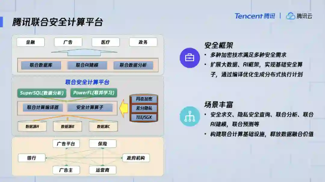 跨机构、跨公司之间的数据协作一直是大数据行业最难解决的问题之一,腾讯联合安全计算平台扩展了现有的大数据和 AI 计算框架,基于联合计算编译和基础安全算子,将数据分析、数据建模的任务,翻译成由安全算子组成的物理执行计划,在多个数据源之间完成安全、协同的联合计算。整个平台提供了联合数据库、安全求交、隐私安全查询、联合分析、联合建模等计算能力,可以广泛应用在政府机构、金融服务、广告平台等多种行业。