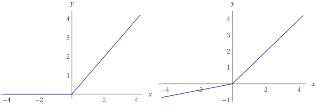 激活函数:ReLU(左),Leaky ReLU(右)。请注意,当 x 为负值时,Leaky ReLU 有一个很小的斜率。