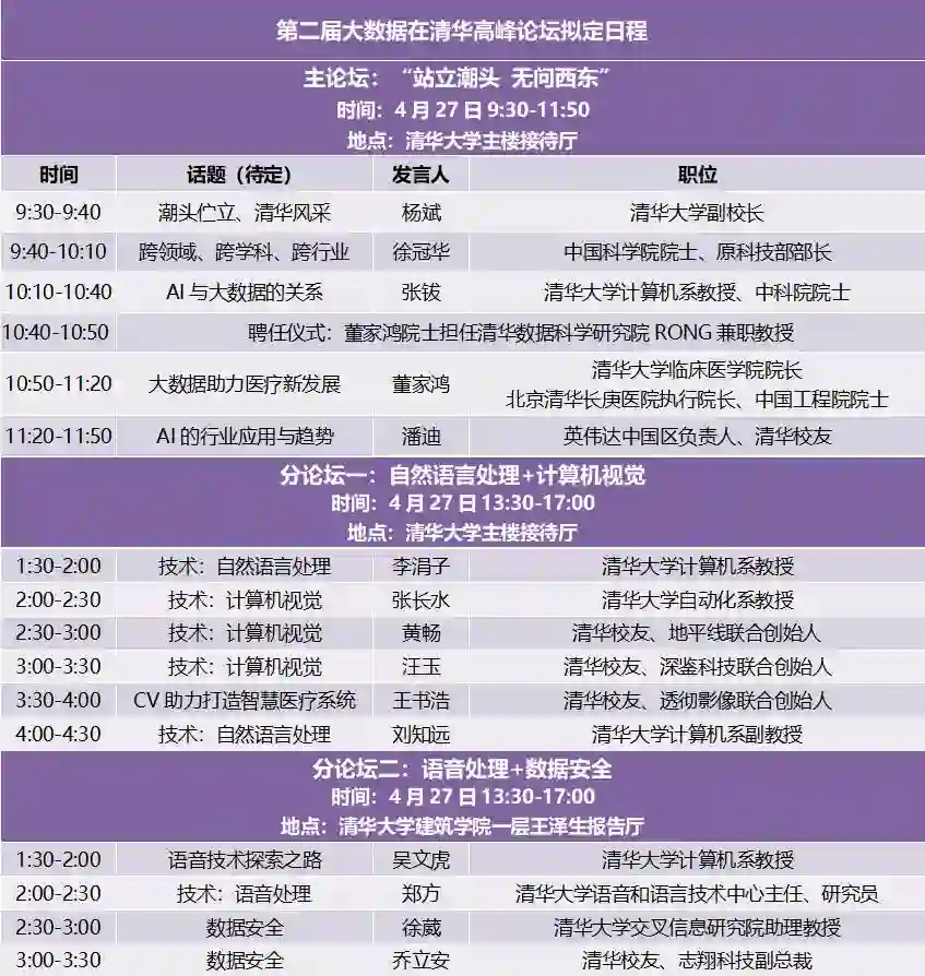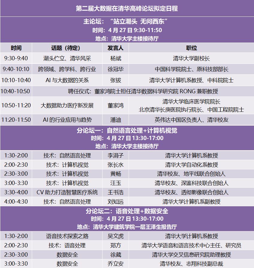 景昃鸣禽集,水木湛清华。即将迎来清华107周年校庆,值此之际,清华数据科学研究院将于4月27日举办第二届“大数据在清华”高峰论坛。这不仅是一次大数据领域的盛会,更是清华大学集中展示其教师和校友在大数据科研/技术/应用方面成果的平台。