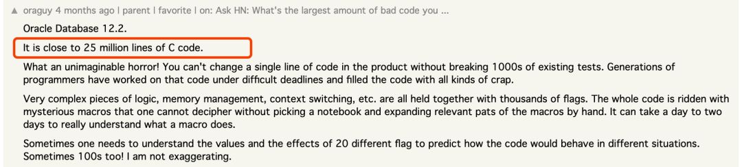 Oracle 12.2这个版本,有将近2500万行C代码!(相比较而言,最受欢迎的NoSQL数据库Redis最新版本5.0.4也不过2万多行代码,真是短小精干。)