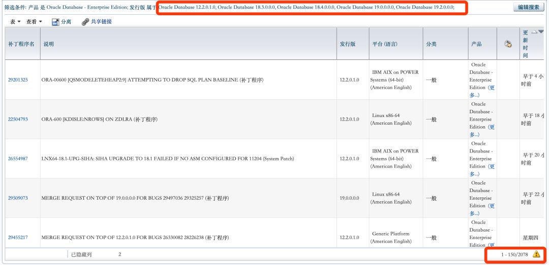 到目前为止,Oracle 12.2系列的fix patch数量是2078个: