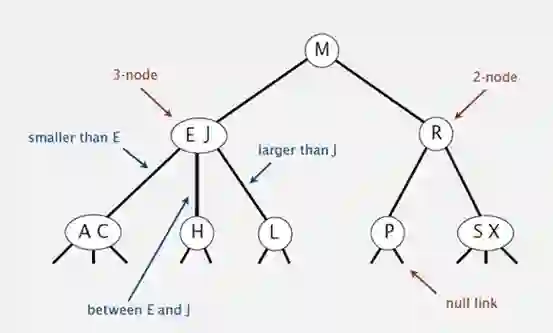 可以放2-3个节点,所以他大大减少了树的高度更便于查找和插入了。其数据结构是整个样子的他的左节点小于其根节点,其中间的子节点(要是存在的话)在根节点的二个值之间,其右节点大于根节点。