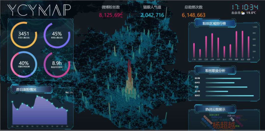 其他还有游戏类作品,这里就不多做介绍了,最后要为大家介绍一个利用数据可视化技术实现的超级酷炫的超越粉丝大数据地图——《YCYMAP》。