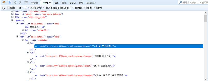 这样我们可以看到,每一章的链接地址都是有规则地存放在<li>中。而这些<li>又放在<div id=”book_detail” class=”box1″>中。