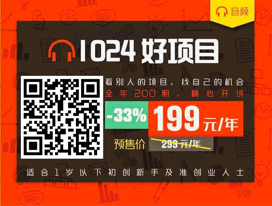 为此,一直定位于服务创业者的创业邦,在去年11月重磅推出了创业音频节目《1024好项目》,以年为期限,一年为你剖析200个创业好项目。在音频里,我们不是简单的介绍项目就完事,而是把这些项目肢解成几大板块,横向和纵向的去剖析。不仅剖析项目本身,也会以小见大地纵观整个行业。一年200期项目,199块钱,平均下来一天也就5毛钱。在这个5毛钱连个冰棍都买不了的时代,还有比这更划算的吗?