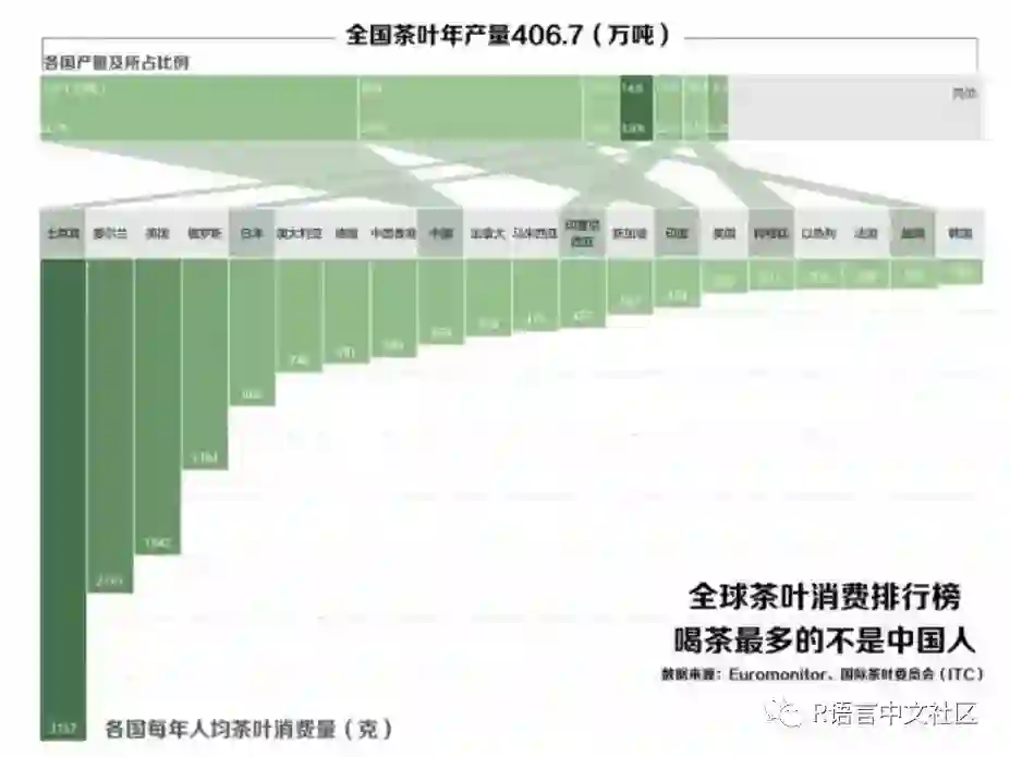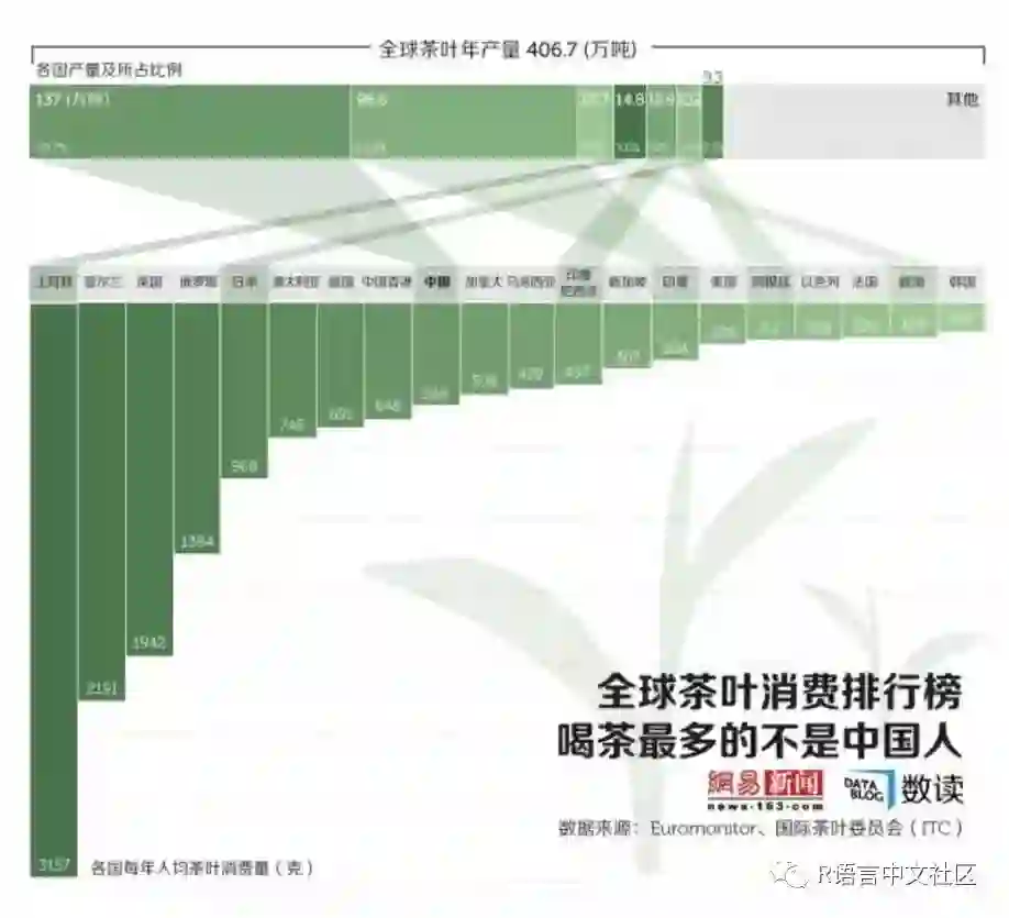 annotate("text",x =5,y=80,label="各国每年人均茶叶消费量(克)",family="myfzhzh",size=11,colour="#515551")+