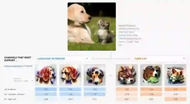 从网络中发现,识别狗时有好几个检测软塌塌的耳朵的检测器发挥了重要作用;而检测猫时就换成了尖耳朵的检测器