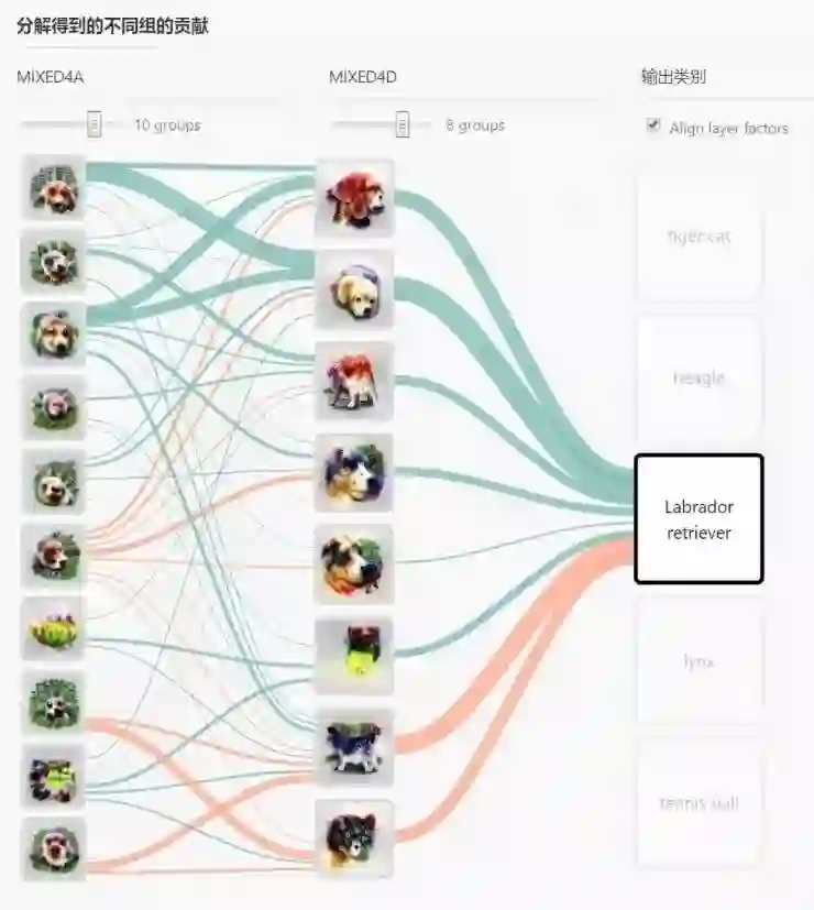 图例还同时更新显示其对输出类的归因(即此通道支持的top类是什么?)。点击一个通道可以让我们深入了解层到层的归因,让我们显式地确定较低层中哪些是最有贡献的通道,或者较高层中哪些是最受支持的通道。
