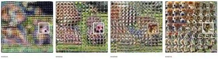 另外,通过跨层(例如「mixed3a」,「mixed4d」)的工作,我们还可以观察到网络对输入的理解是如何发展的:从检测早期图层中的边缘,到后期更复杂的形状以及物体的部分。