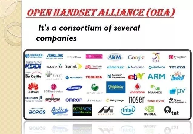 2007年,谷歌牵头成立了“开源手机联盟(Open Handset Alliance OHA)”,成员包括谷歌、HTC、索尼、戴尔、英特尔、摩托罗拉、三星、LG等,后来扩展到三十多家著名的芯片制造商、手机制造商、软件开发商、电信运营商和服务商,中国移动也加入其中。OHA联盟致力于解决“如何制造一部更好的手机”的问题,制定行业标准。这为安卓系统快速形成生态、大杀四方奠定了基础。