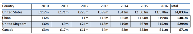 在AI投资和活动规模方面,英国和其他国家通常被认为是落后于美国和中国的。在全球交易份额方面,英国仍然远远落后于美国,2016年62%的投资交易预计将流向美国的初创公司,只有6.5%的投资会流向英国的创业公司。2010年至2016年,AI公司的全球风投基金中,只有5%的投资流向了英国企业(见下表)。更多的英国投资似乎在早期阶段,英国AI公司中有四分之三的公司在寻求种子或天使投资,而美国公司中寻求种子或天使投资的占二分之一。英国10家AI公司中只有1家寻求成长资本,相比之下,美国的这一数字是五分之一。